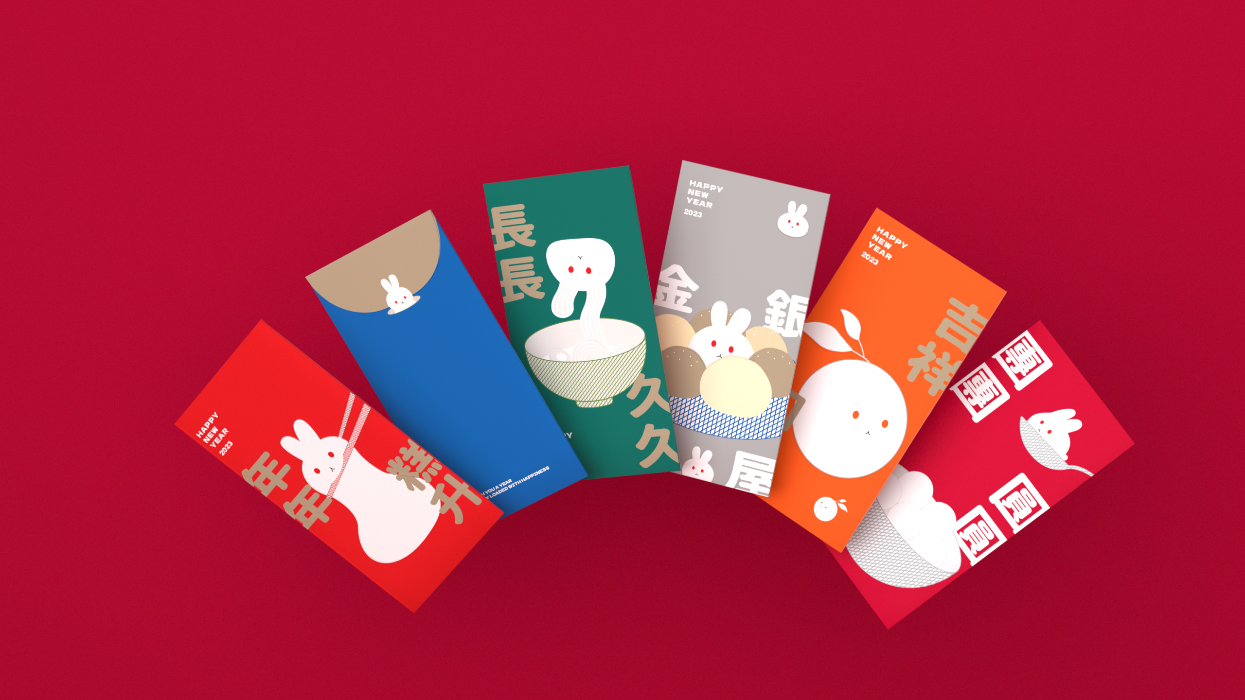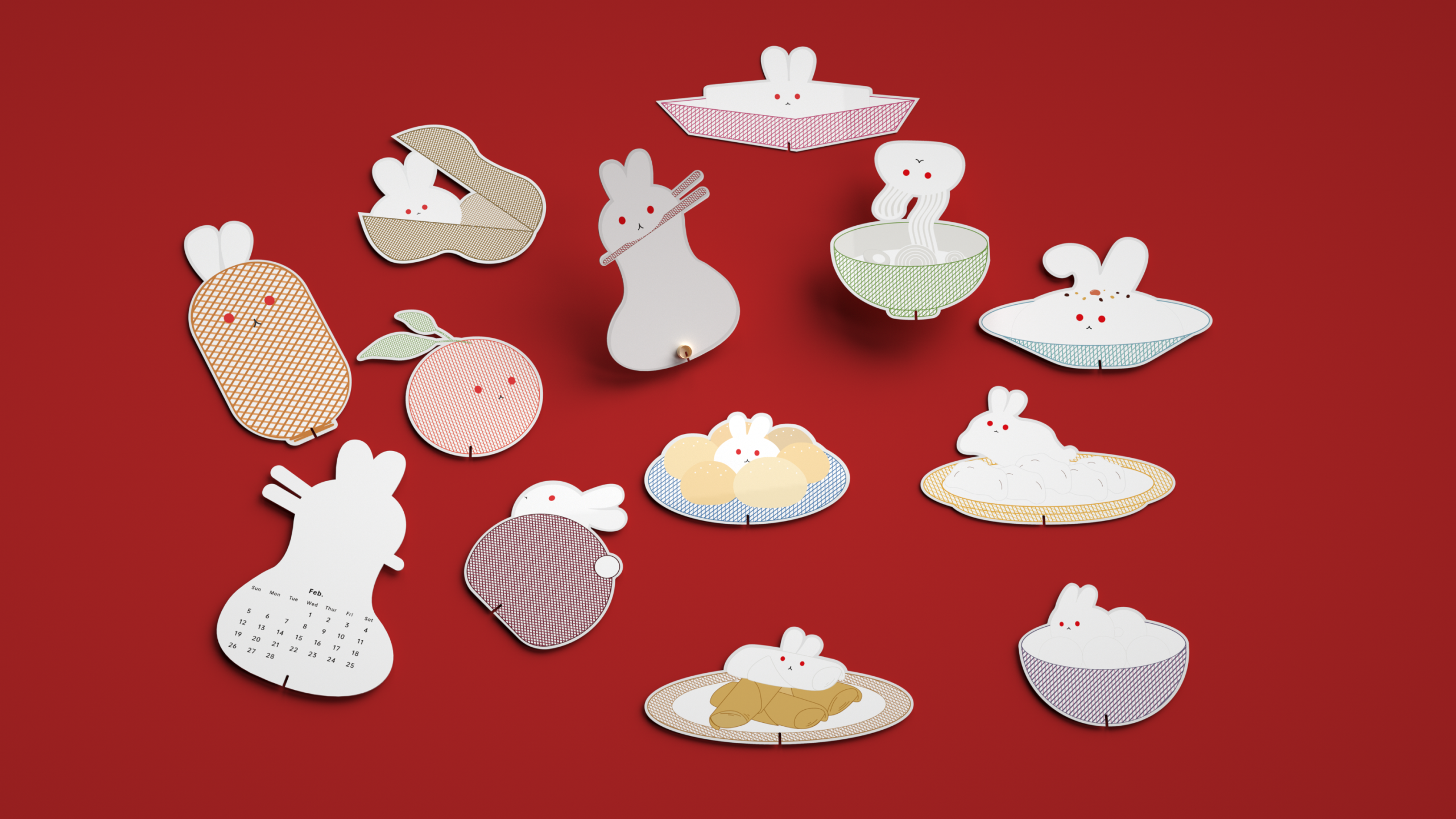 整套礼包的创意通过插画的形式把调皮的小兔子画成中国传统新年年夜饭中常见的几款食物。并且每一款食觉兔都包含着对你满满的新年祝福。祝你新的一年“年年糕升”、“招财进宝”、“长长久久”、“团团圆圆”、“吉祥如意”、“金银满屋”。